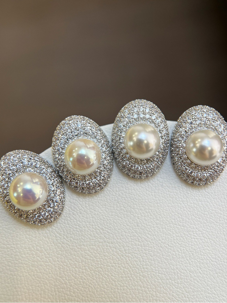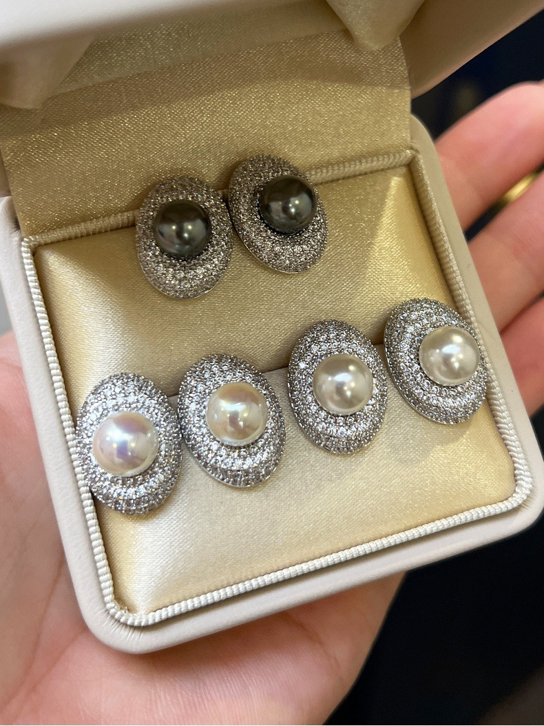 Female Luxury High-End Silver Needle Pearl Full Diamond Oval Earrings